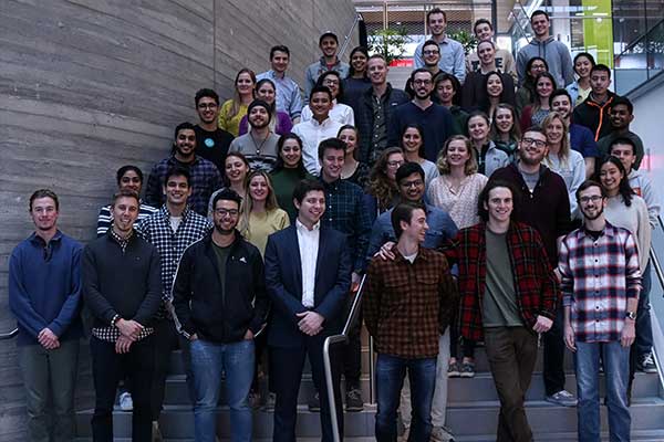 The Department of Bioengineering’s first graduating undergraduate class in 2019. D’Agostino is pictured center/back left, in purple.