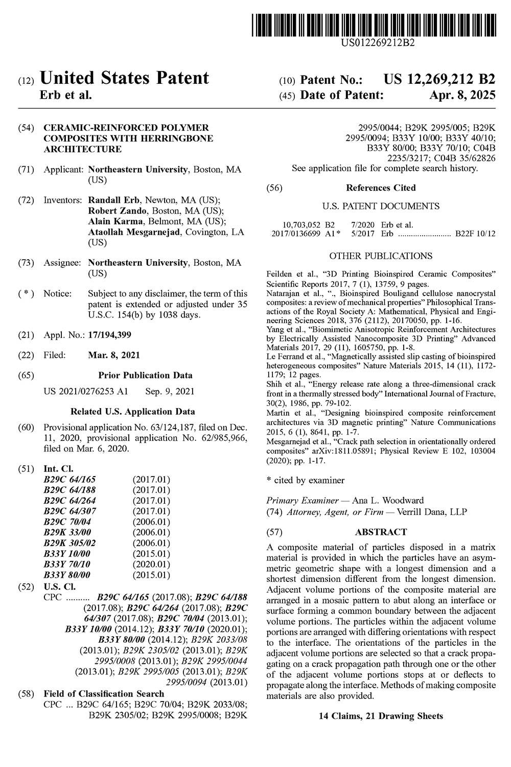 MIE Professor Randall Erb and BioE/MIE Affiliated Faculty Alain Karma were awarded a patent for “Ceramic-reinforced polymer composites with herringbone architecture.”