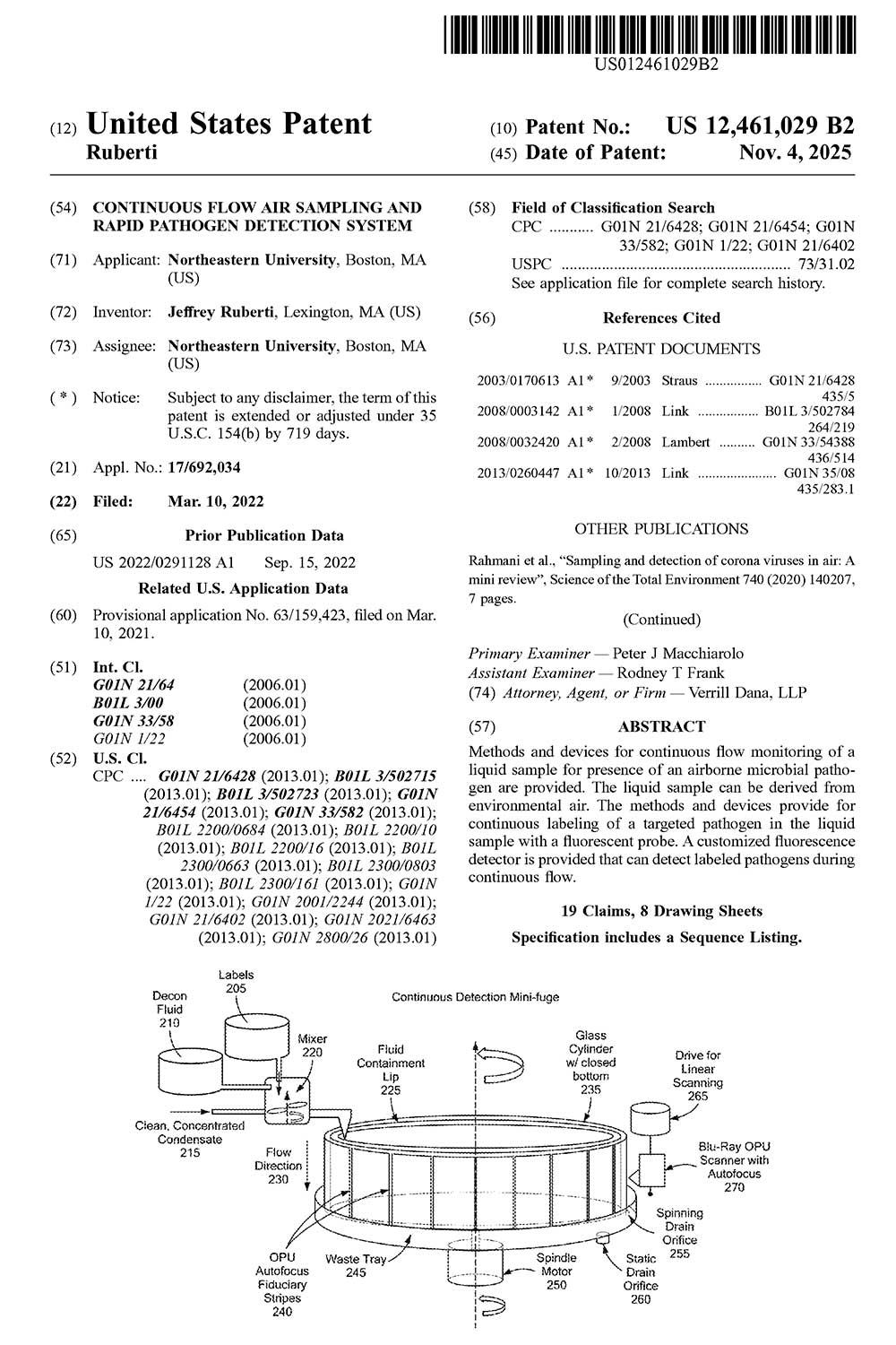 BioE Professor Jeffrey Ruberti was awarded a patent for designing a “Continuous flow air sampling and rapid pathogen detection system.”